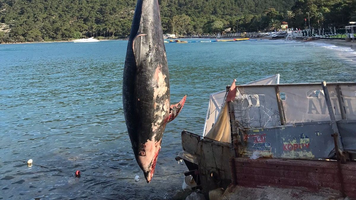 Yapılan fiziki incelemelerin ardından ölü yunus balığı, bulunduğu yerden kaldırıldı.