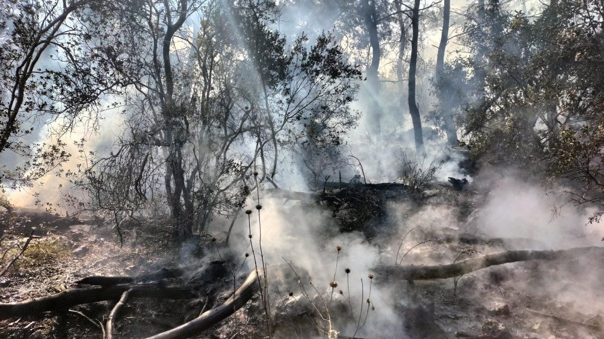 Göynük Kanyonu girişindeki yangını söndürme çalışmalarına 5 arözöz, orman işçileri, gönüllüler ve 67 jandarma görevlisi katıldı.