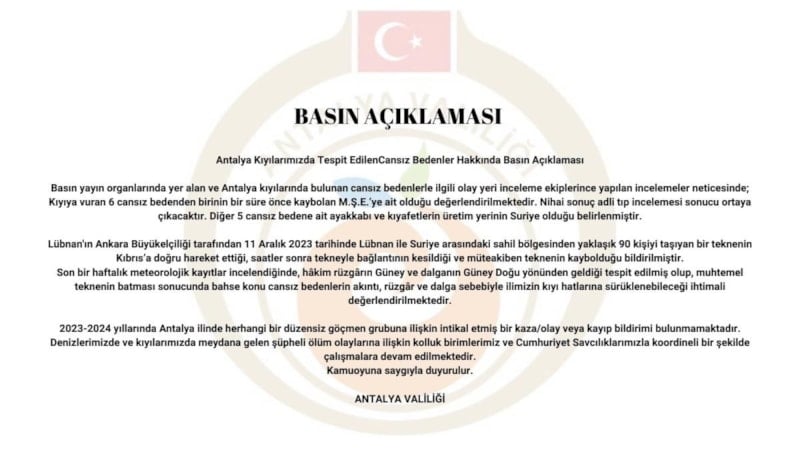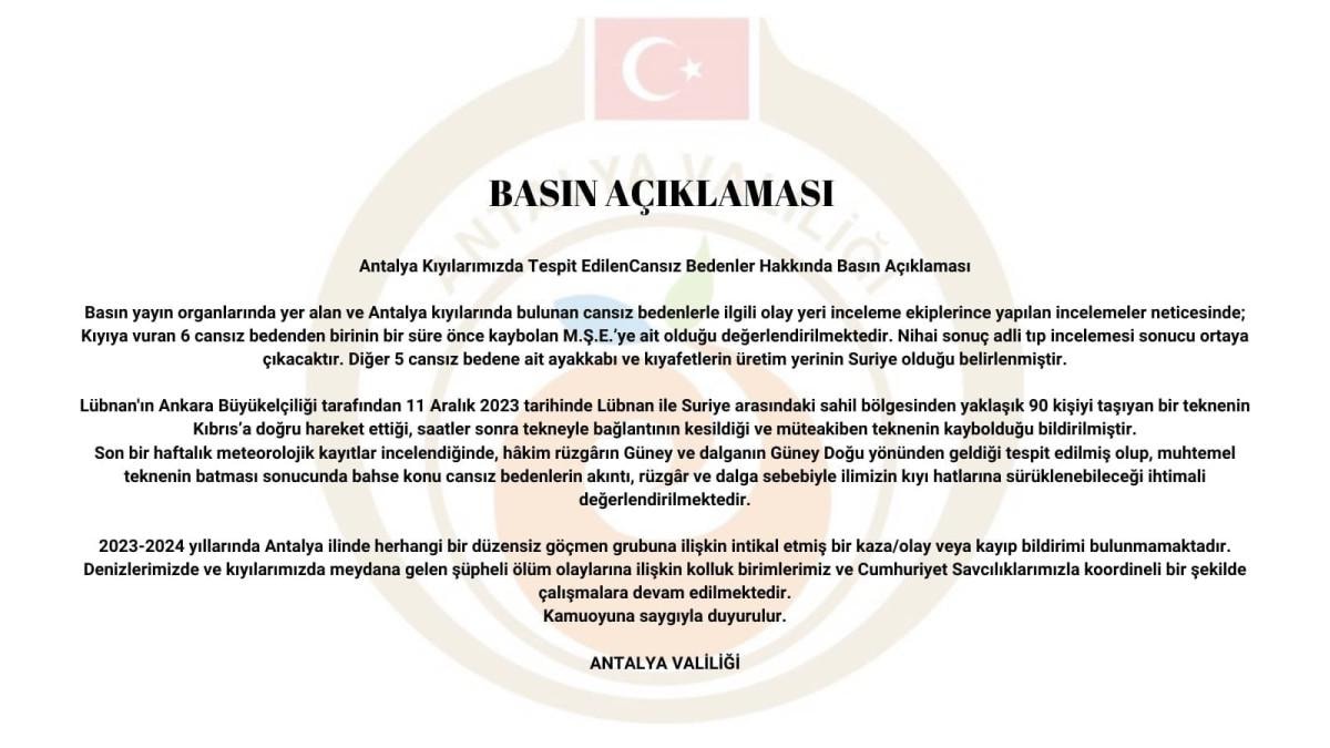Konuyla ilgili Antalya Valiliği'nden yapılan açıklamada cesetlerden birinin kayıp olarak aranan şahsa ait olduğu vurgulanırken, diğer 5 cesedin ise üzerindeki kıyafetlerin üretim yerlerinin Suriye olduğu duyuruldu.