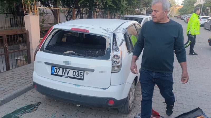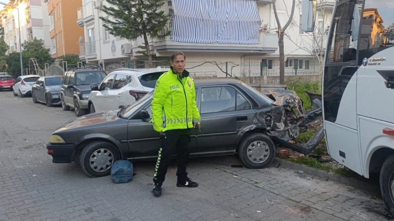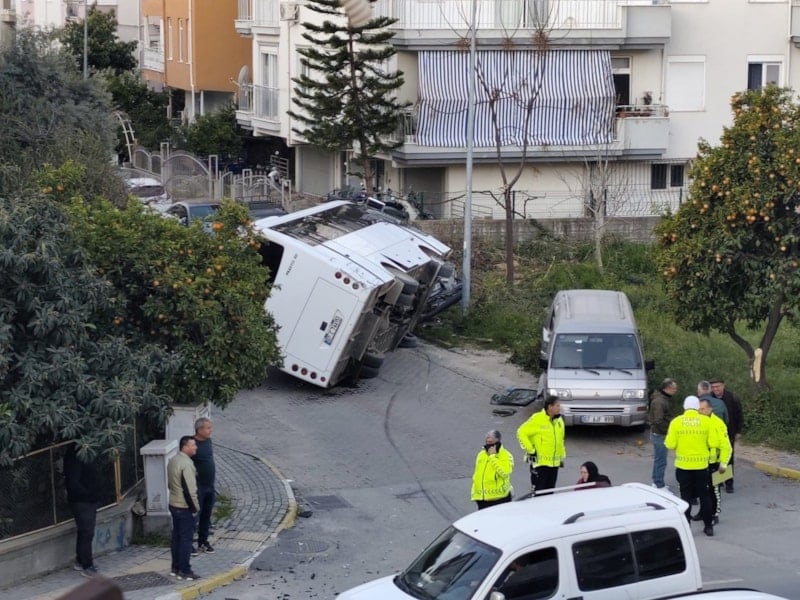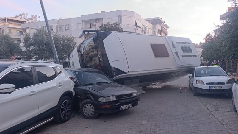 Çarpmanın etkisiyle otel servisi, duramayarak 4023 Sokak üzerinde park halindeki araçların üzerine devrildi.