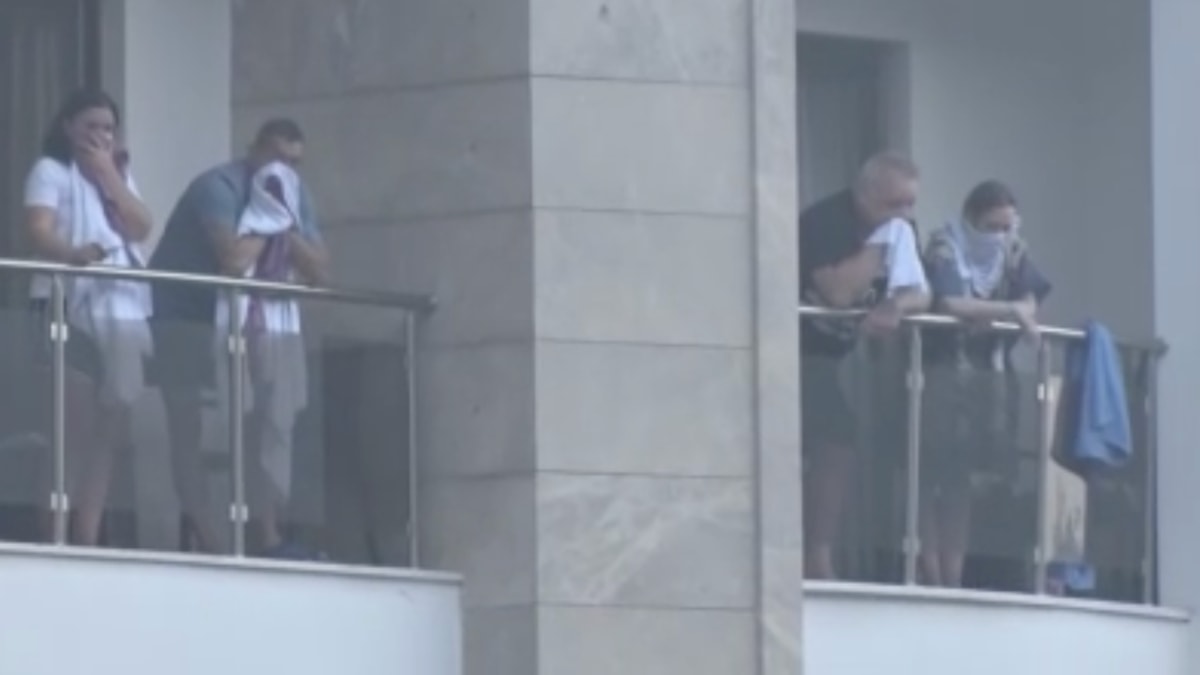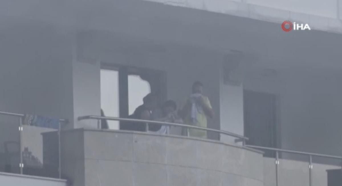 Dumanların sardığı otelde konaklayan turistler, canlarını kurtarmak için balkonlara sığındı.