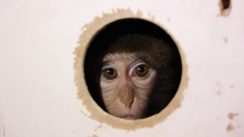 Girişteki görevliler koli içerisinde ahşap delikli kutuda maymun olduğunu fark etti.