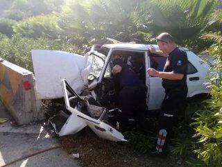 Kemer ilçesinden Antalya yönüne seyreden Alim Şirinler yönetimindeki 07 V 7187 plakalı otomobil, sürücünün direksiyon hâkimiyeti kaybetmesi nedeniyle kontrolden çıkarak yol kenarındaki beton bariyerlere çarptı.