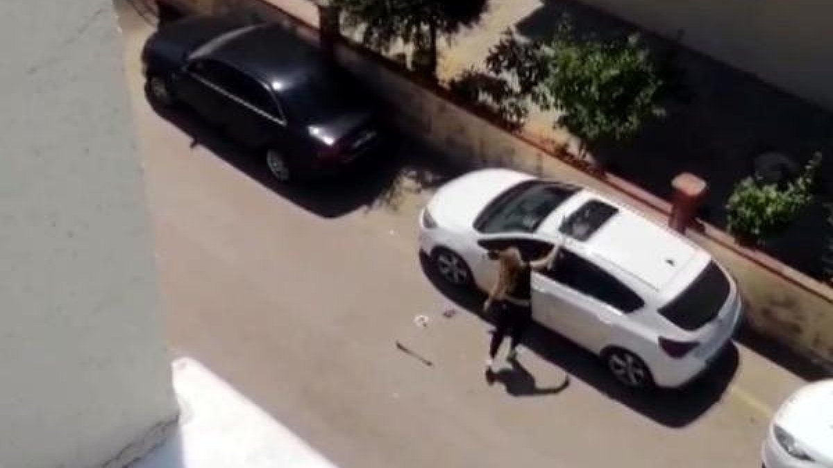 Antalya'nın Kepez ilçesine bağlı Yenidoğan Mahallesi'nde, elinde demir çubuk bulunan kimliği belirsiz kadın, park halinde duran beyaz renk araca vurmaya başladı.