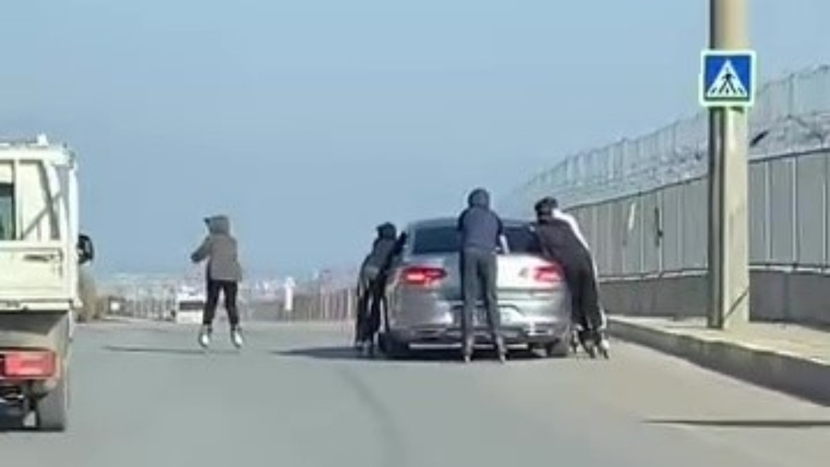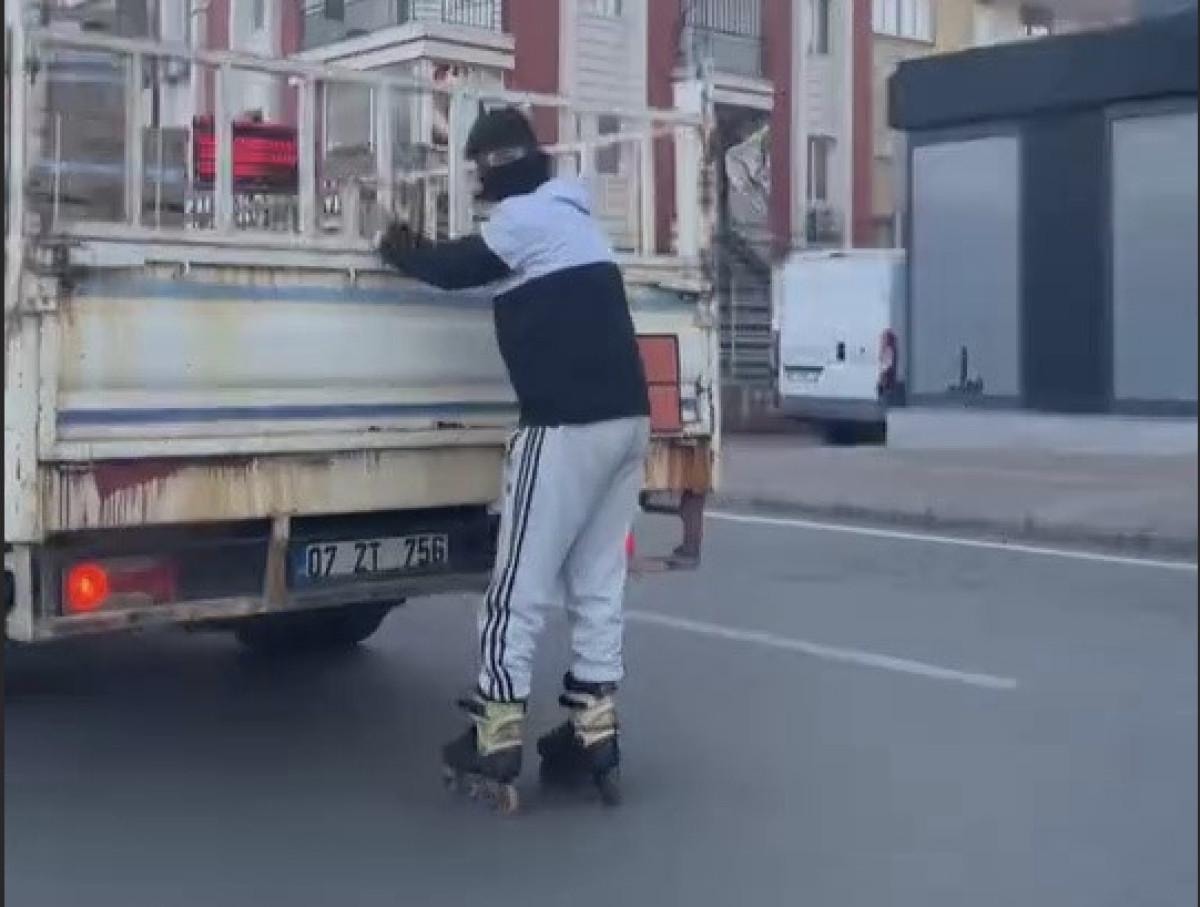 Cep telefonu kameralarına yansıyan görüntülerde süratli giden halk otobüsünün arkasına tutunan 3 patenci dikkat çekerken, bir başka görüntüde ise bir gencin kamyonet kasasına tutunduğu görüldü.