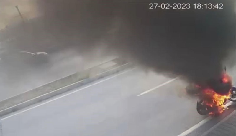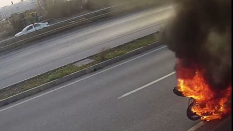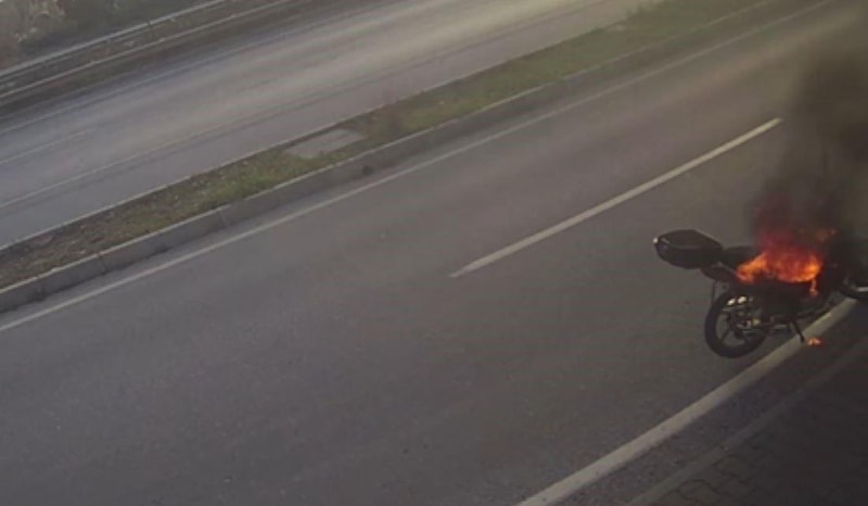 Görüntülerde, bir kişinin motosikleti yol kenarına bırakıp gittiği, 1-2 dakika sonra geri dönerek plakasını söktüğü motosikletini yaktığı, sonra da uzaklaştığı, motosikletten alevlerin yükseldiğini gören iş yeri çalışanlarının yangın tüpüyle müdahalede bulunduğu ancak yanmasını önleyemediği görüldü.