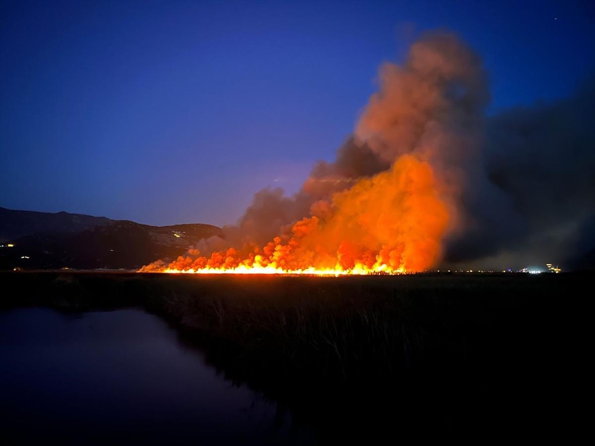 Sazlık alanın bataklık olması nedeniyle müdahaleyi güçlükle yapan ekipler, yangını kontrol altına alma çalışmalarını sürdürüyor.