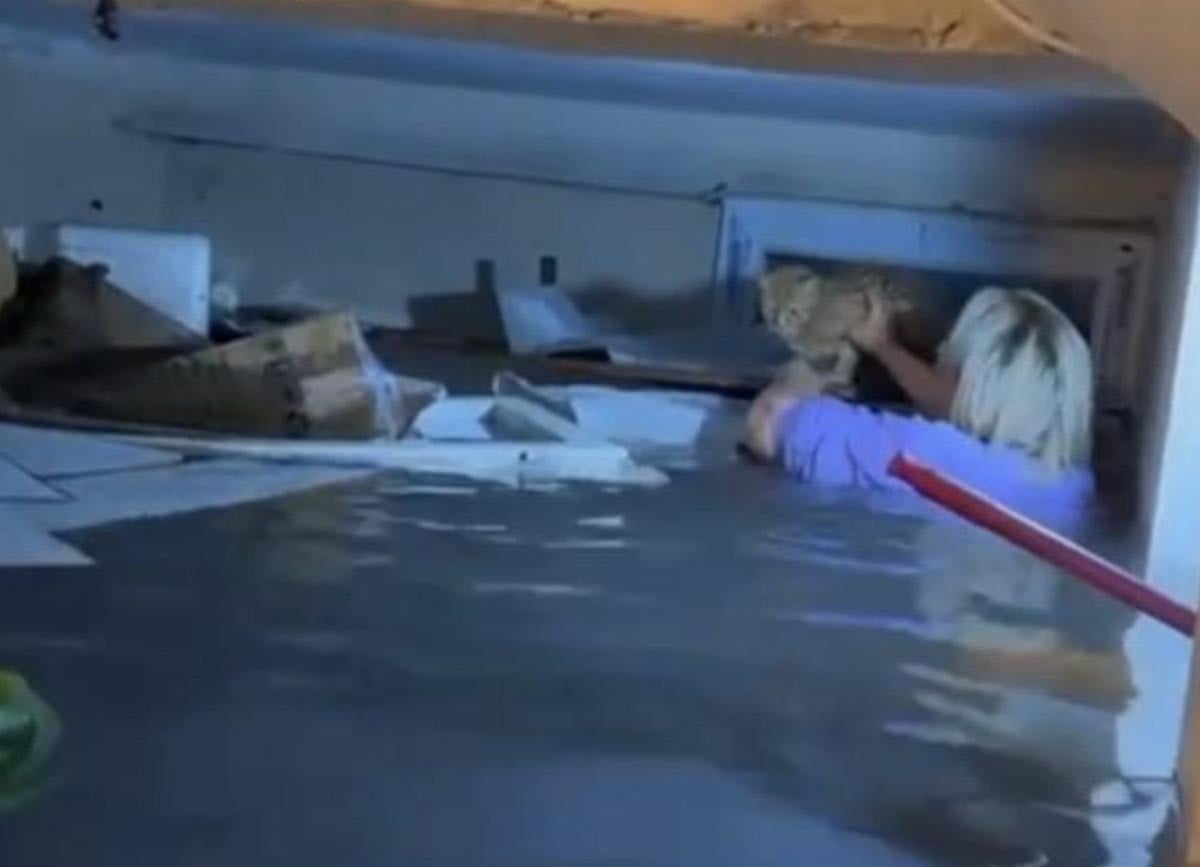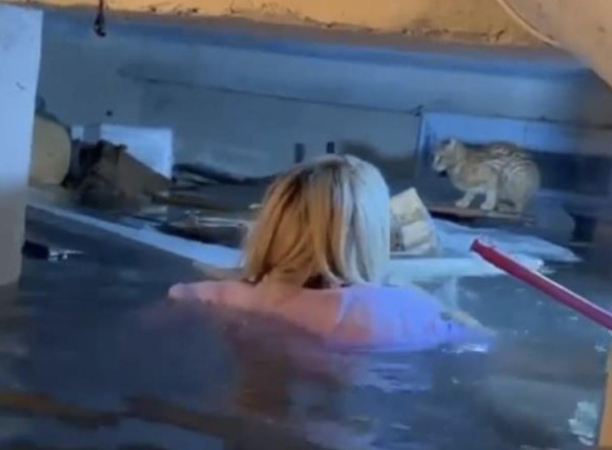 Bir apartmanın su dolan bodrum katında bir kedi mahsur kaldı.