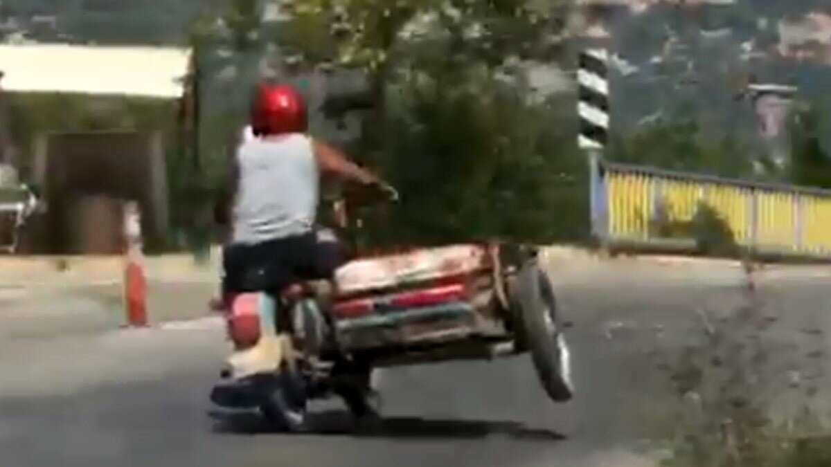 Sorumsuz sürücü, motosikletin sepet kısmını yan yatırarak bir süre iki teker üzerinde ilerledi.