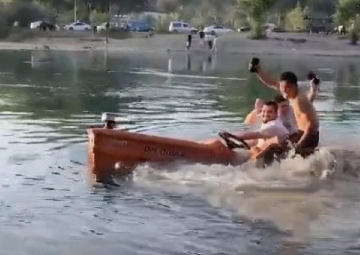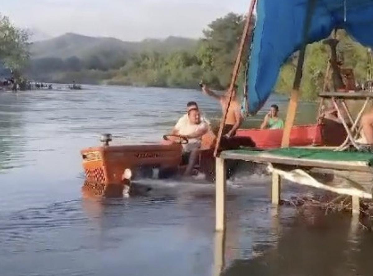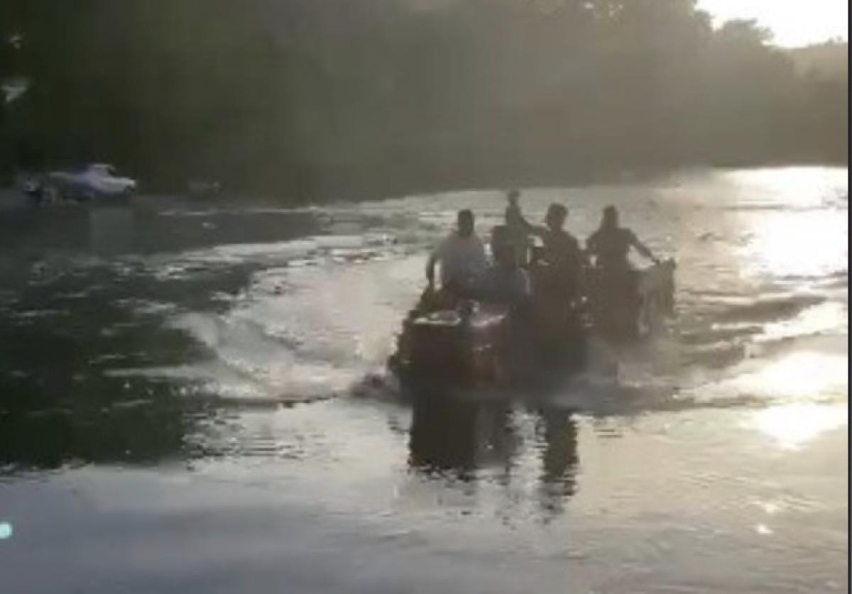 İlk bakıldığında tekne gibi görünen ve suda hızla hareket eden cismin, römork takılı traktör olduğu sonradan anlaşıldı.