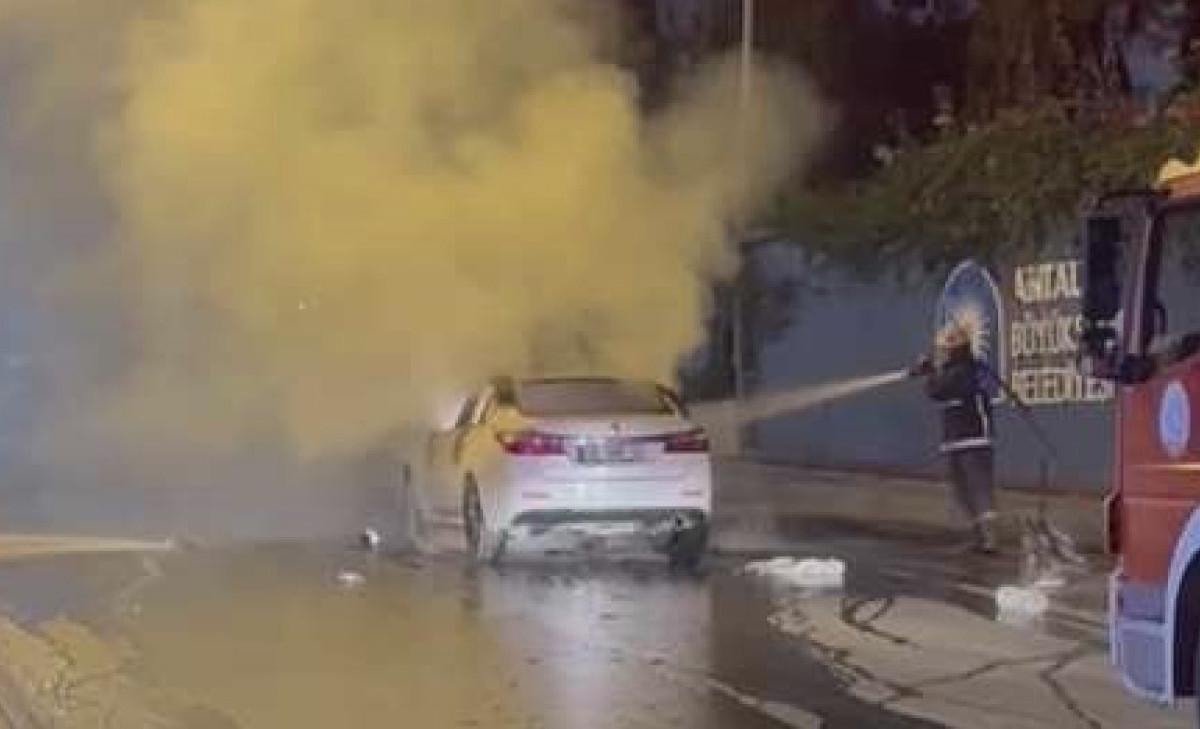 Antalya'nın Muratpaşa ilçesinde, seyir halindeki otomobilden dumanların çıktığını gören araç sürücüsü, aracı yol ortasında durdurarak yangına müdahale etmek istedi.