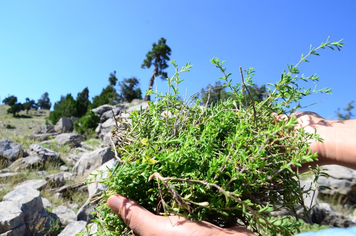 Yüksek rakımlı Göktepe Yaylası'nda taşların arasından çıkan kekikleri toplayarak kışın yemeklerde ve hastalıklarda içecek olarak kullandıklarını belirten Çatlı, "Taş kekiği ismi gibi taşların arasında oluşur. Buranın rakımı bin 800 metredir. Bazı vatandaşlar kekiğin bağını 10 liraya satıyorlar. Çok faydalı bir bitkidir şifa kaynağıdır.