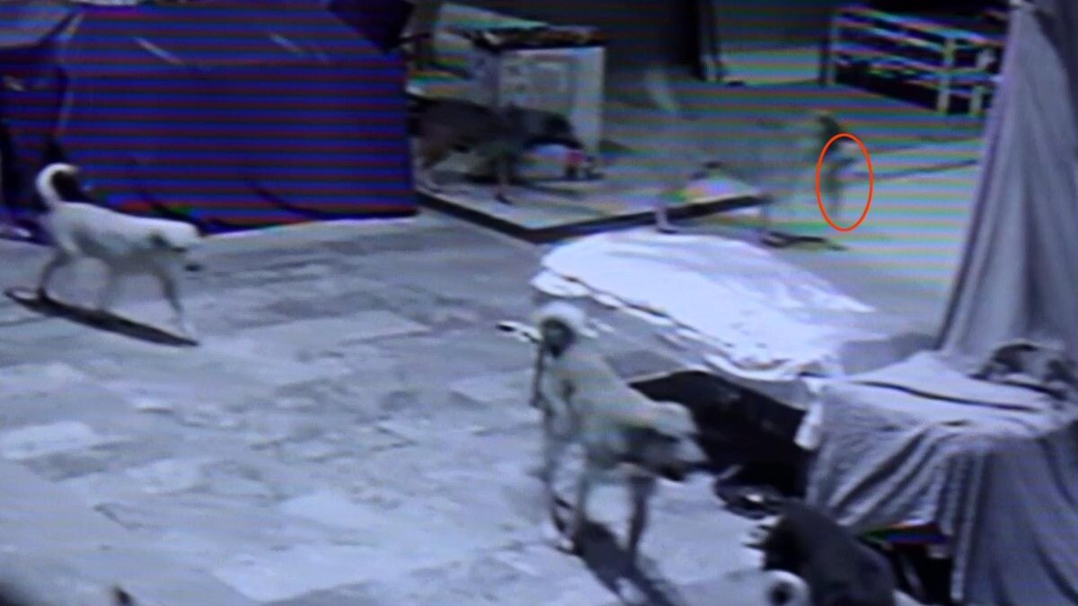 Köpeklerin, kediyi yakalamak için yaptıkları anbean güvenlik kamerasına yansıdı. Kamera görüntülerinde kedinin tezgahın yanına geldiği gece olduğu için fark edilmezken, 10'dan fazla köpeğin tezgahın etrafına geldiği görülüyor.