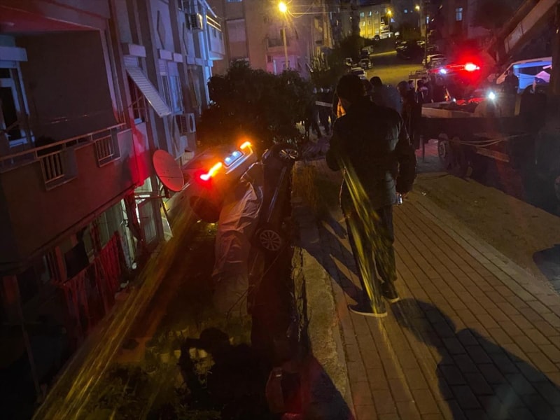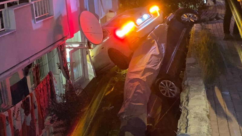 Polis memurunun uyarısının ardından aniden gaza basan sürücünün kullandığı otomobil, önce yakındaki çöp konteynerine ardından park halindeki otomobili de çarparak, yaklaşık 3 metre yükseklikten apartman bahçesine uçtu.