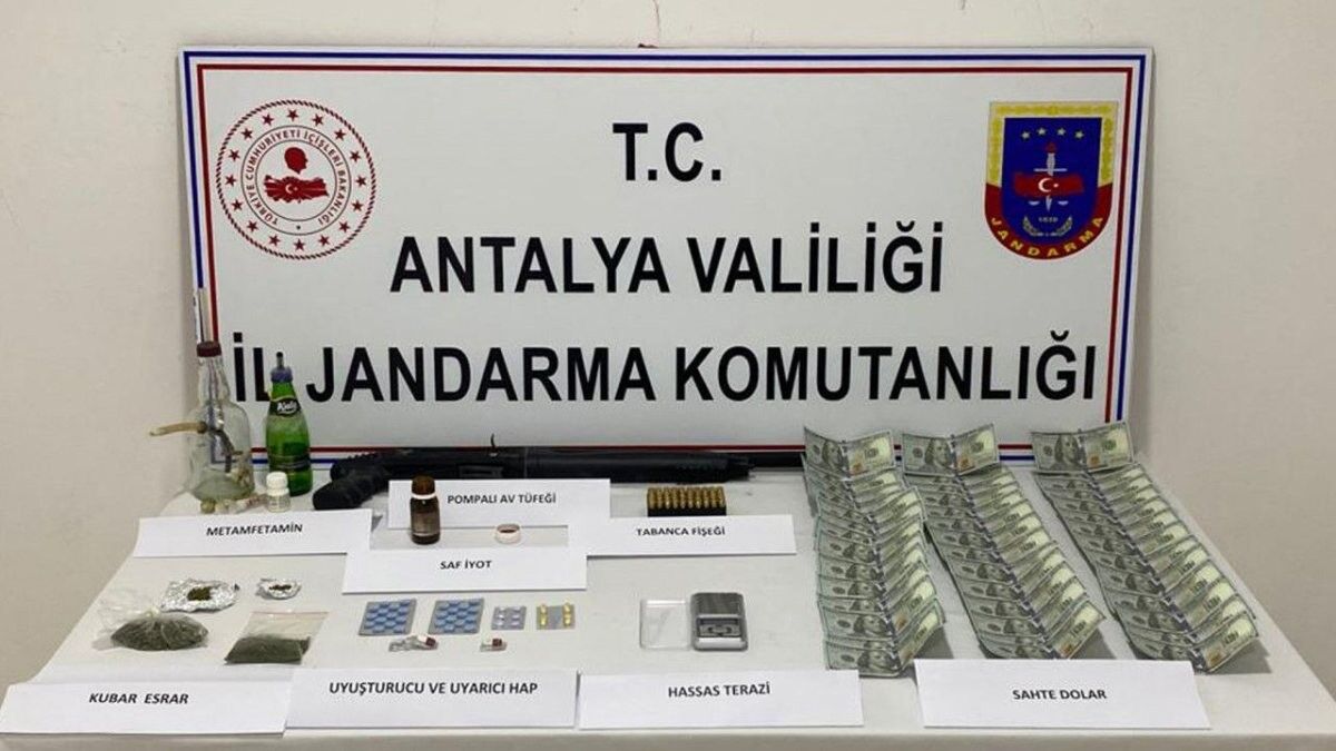42 sahte 100 dolarlık banknot, 5 parça halinde toplam 21 gram esrar, metamfetamin imalatında kullanılan ve ana etken madde olan 100 gram saf iyot, 48 uyuşturucu ve uyarıcı hap, 1 gram metamfetamin, uyuşturucu satışında kullanılan hassas terazi, uyuşturucu satışında kullanılan 13 boş ambalaj, 4 uyuşturucu madde kullanma aparatı, 9 mm 50 tabanca fişeği, ruhsatsız pompalı av tüfeği.