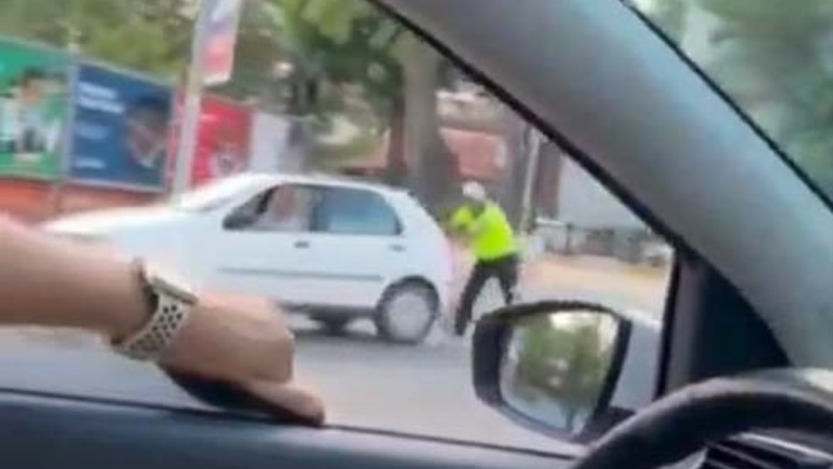 Yolda kalan aracı gören bir trafik polisi sürücüye yardımcı olmak için aracını itmeye başladı.