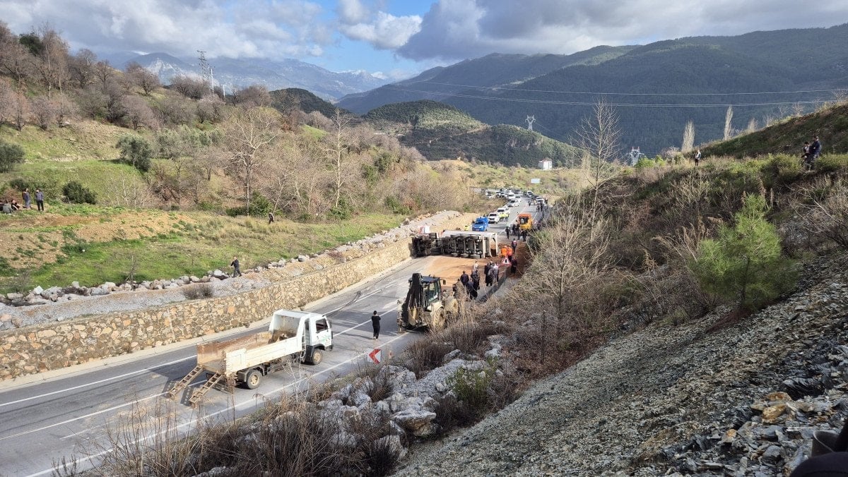 Antalya'nın Alanya ilçesinde sürücüsü belirlenemeyen kum yüklü kamyon, aynı güzergahtaki yine plakaları ve sürücüleri belirlenemeyen 2 otomobille çarpıştı.