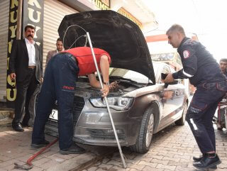 Şanlıurfa'nın Viranşehir ilçesinde bir otomobilin motor kısmından gelen sesler üzerine vatandaşlar kediyi kurtarmak için çalışma başlattı.
