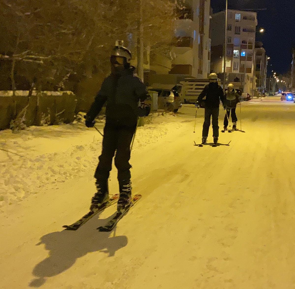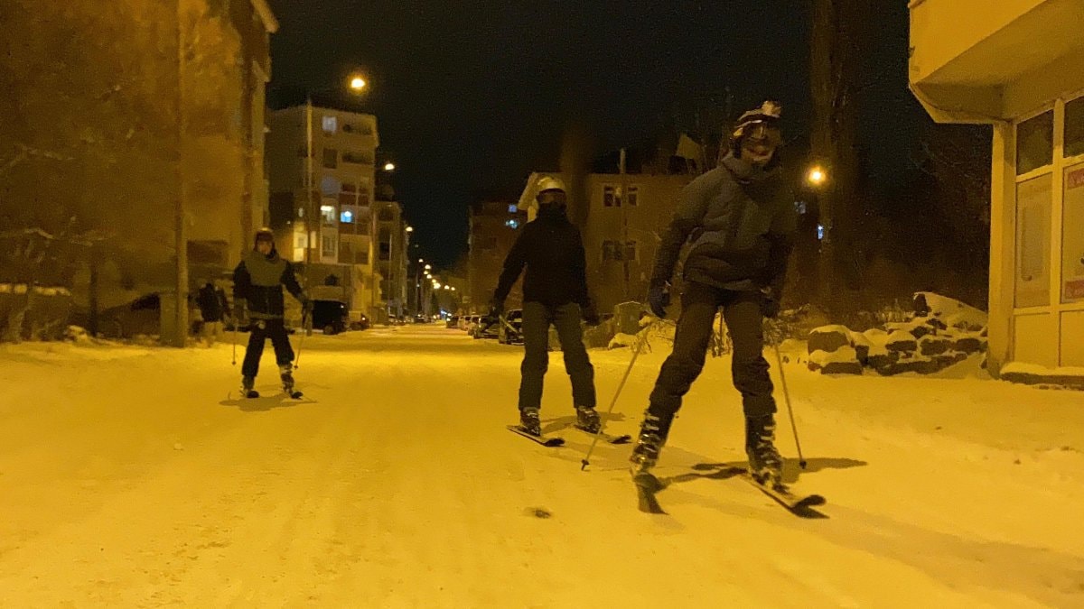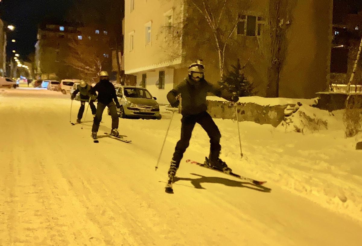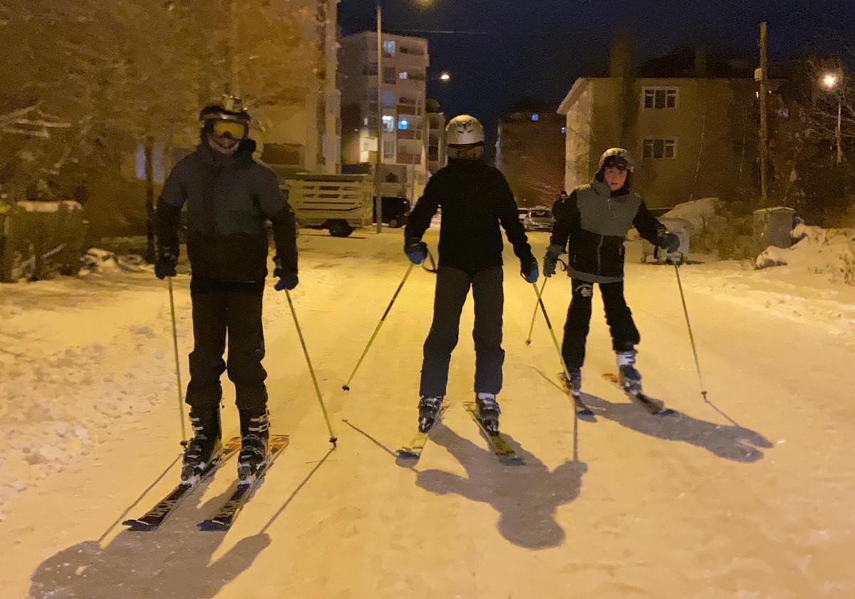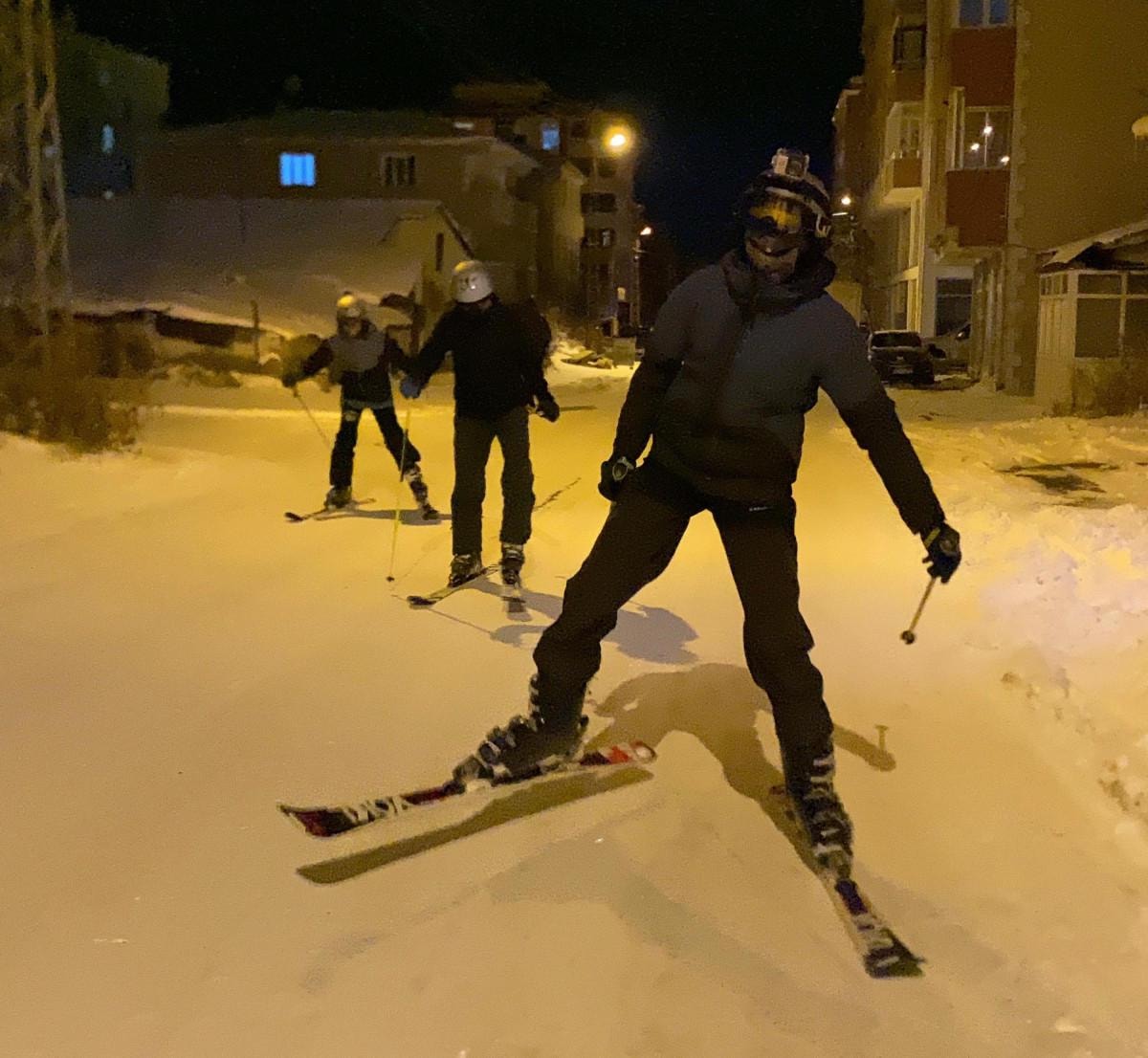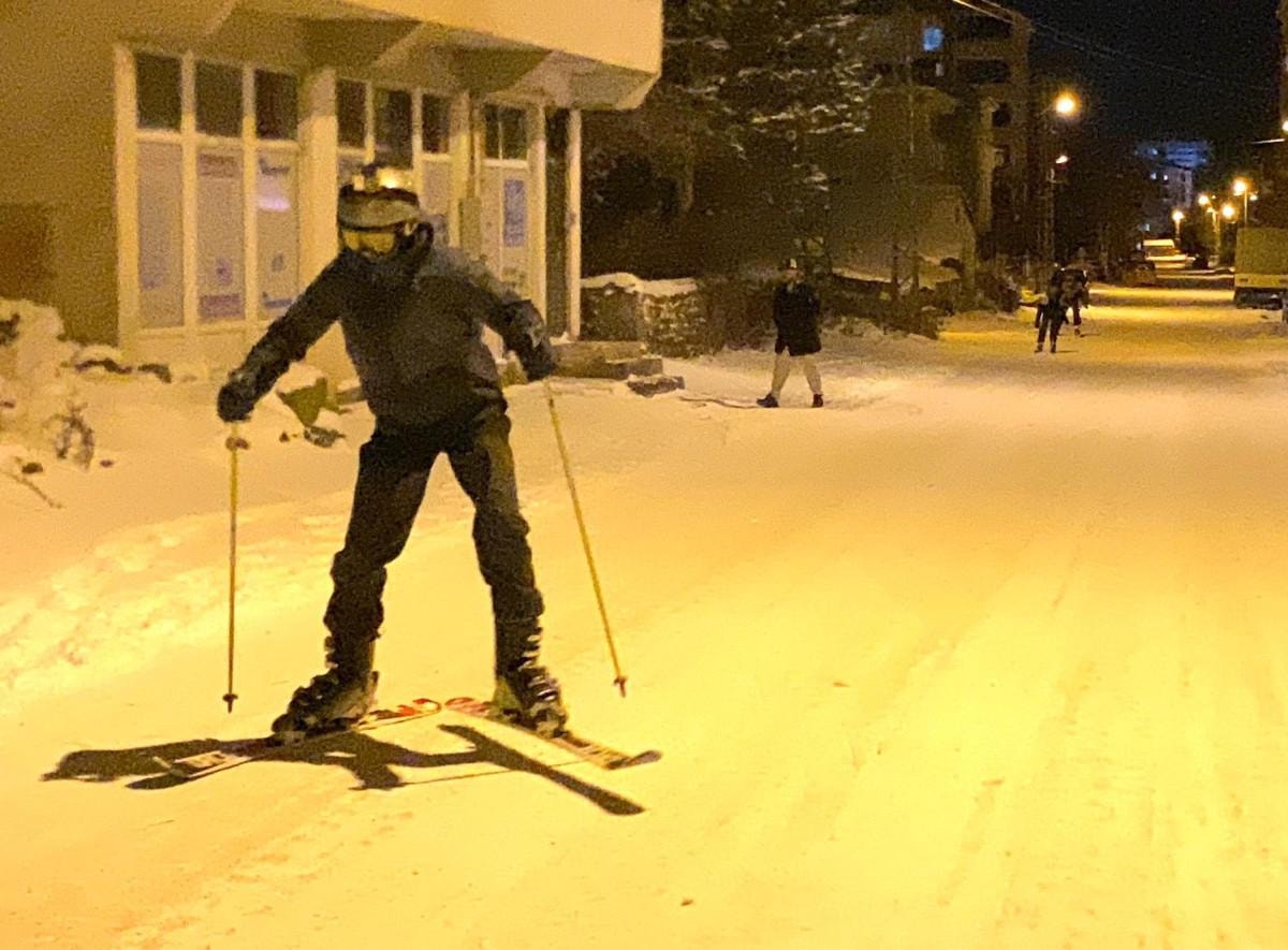 Yeterli kar olmadığı için Yalnızçam Kayak Merkezi'ne gidemeyen 3 arkadaş, kent merkezinde kayak takımlarını giyerek cadde ve sokaklarda kayak yaptı.