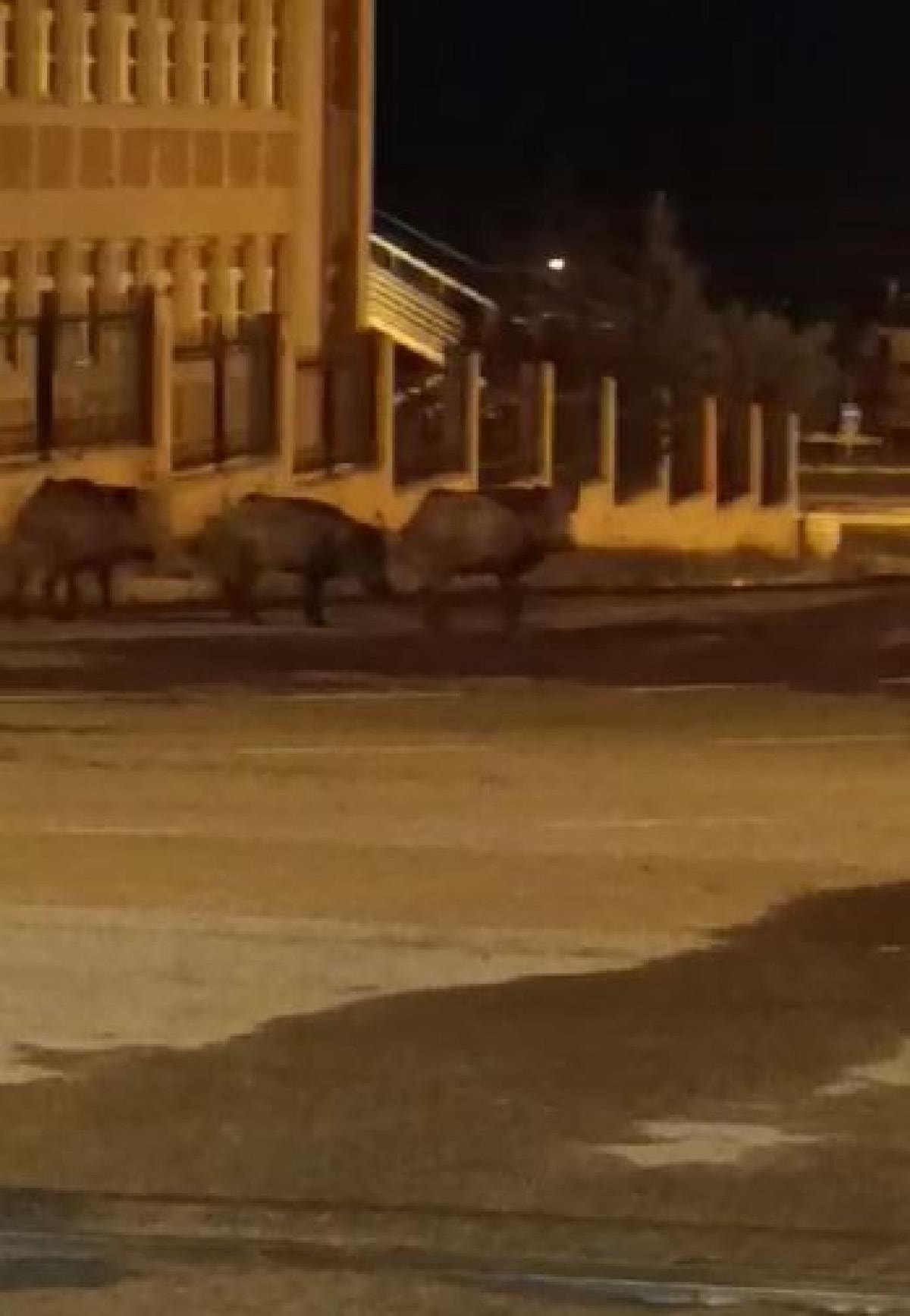İnsanların sokakta olmadığı bu saatlerde rahatça dolaşan domuzlar, yiyecek bulmak için uzun süre çevrede gezdi.