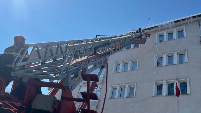 Özellikle halkın yoğun olarak kullandığı cadde ve sokaklarda buz kırma mesaisi yapan itfaiye ekipleri, binaların çatılarında oluşan buz sarkıtlarını birer birer kırıyor.