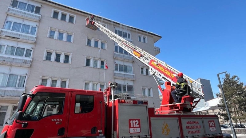 Bazı noktalarda 4-5 metreyi bulan buz sarkıtları tehlike oluşturunca, Ardahan Belediyesi itfaiye ekipleri devreye girdi.