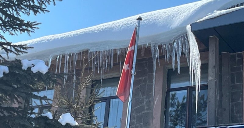 Ardahan'da etkili olan soğuklarda bazı binaların çatı ve saçaklarında 4-5 metreyi bulan buz sarkıtları oluştu.