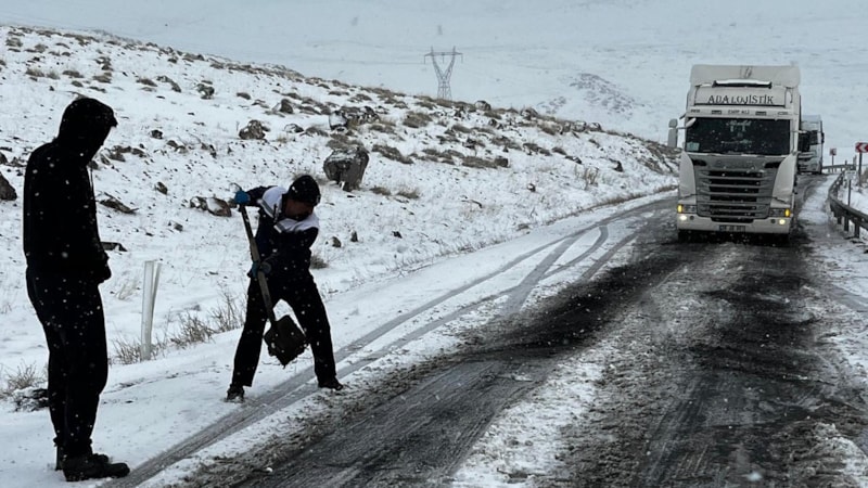 Akçakale köyü yakınlarında mahsur kalan tır şoförleri, araçlarını hareket ettirebilmek için yol kenarından kürekle aldıkları kumları buzlanan zemine sererek, araçlarını bulunduğu yerden çıkarmaya çalıştı.