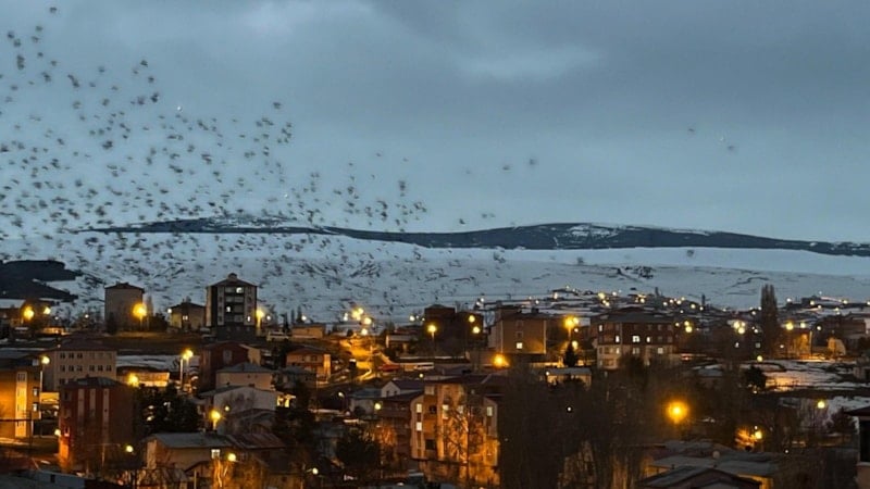 Ardahan'da dün akşam saatlerinde ortaya çıkan binlerce karga, gökyüzünü adeta siyaha bürüdü. Kargaların yoğunluğu ise vatandaşları ürküttü.