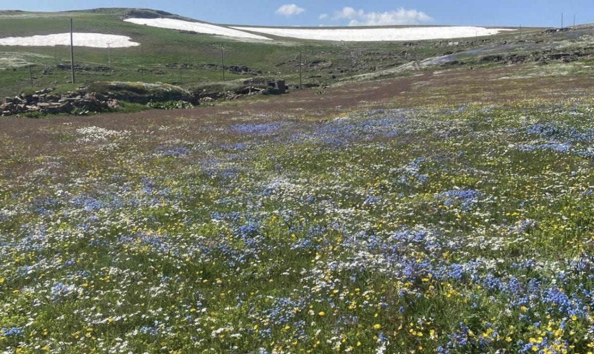 Ardahan'daki yaylalarda baharda açan çiçeklerle karlar aynı anda görüntülendi.