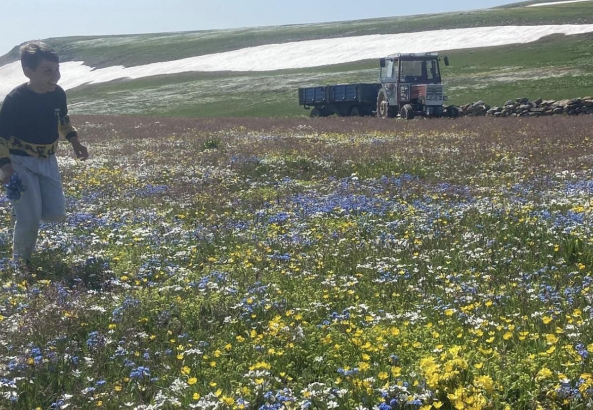 Yaylanın etrafını çevreleyen dağların yüksek kesimlerindeki kar birikintileri, eteklerde çiçek açan bitki örtüsüyle birleşince kartpostallık görüntüler ortaya çıktı.
