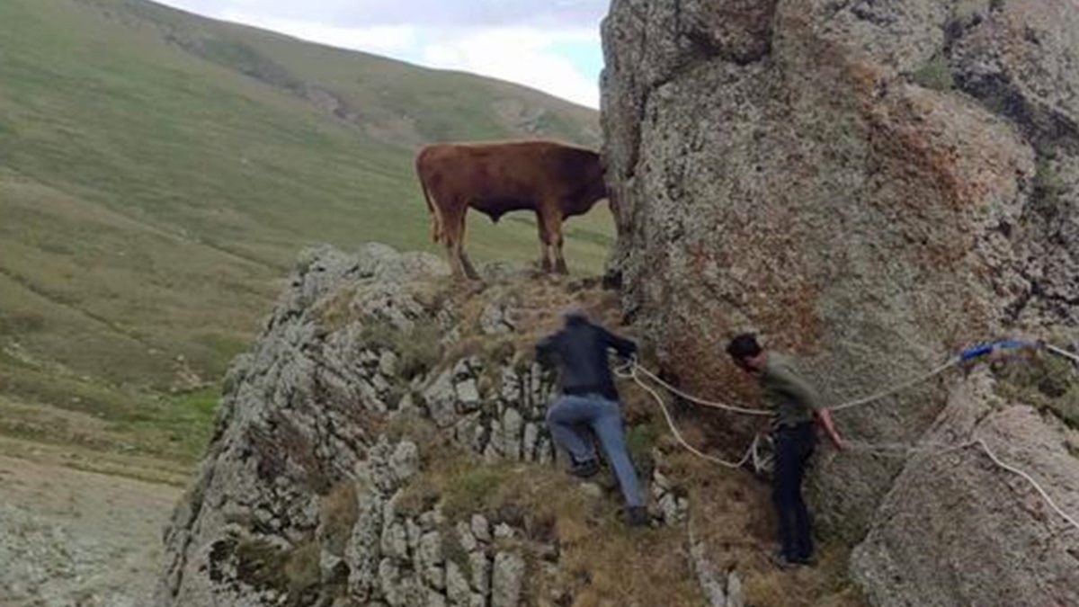 Ardahan'da kayalıklarda mahsur kalan inek, halatla kurtarıldı ViDEO