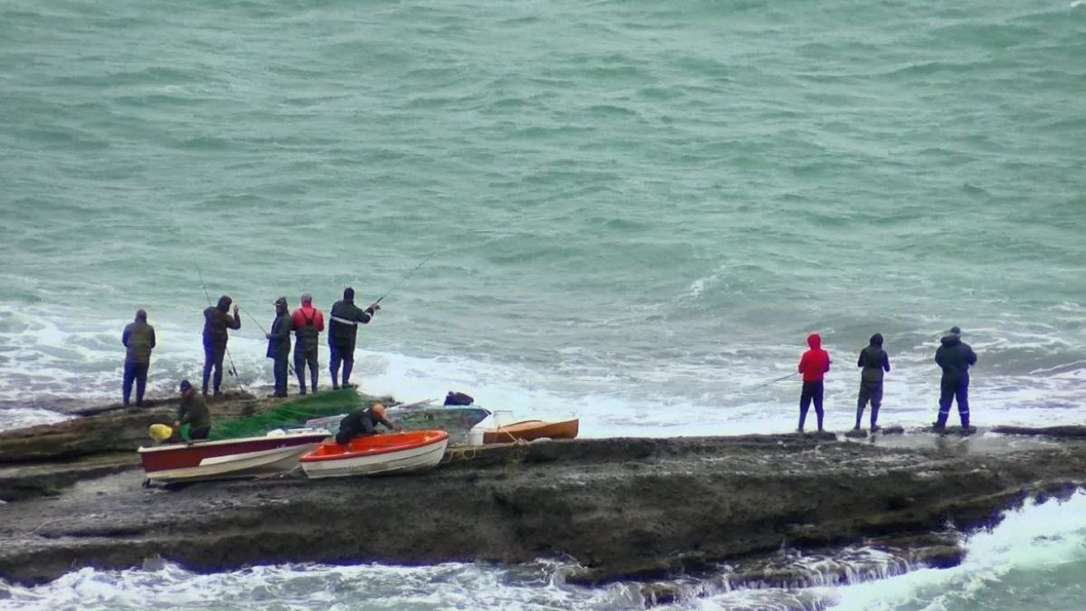 Yaklaşık 10 kişilik bir grup, deniz ortasındaki kayanın üzerine çıkarak oltayla balık tuttu.