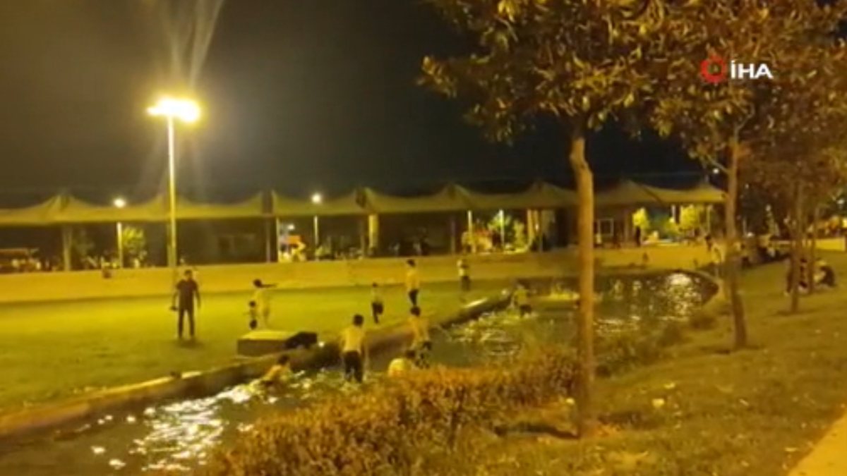 Çocuklar, parkta bulunan süs havuzuna girmeye başladı.