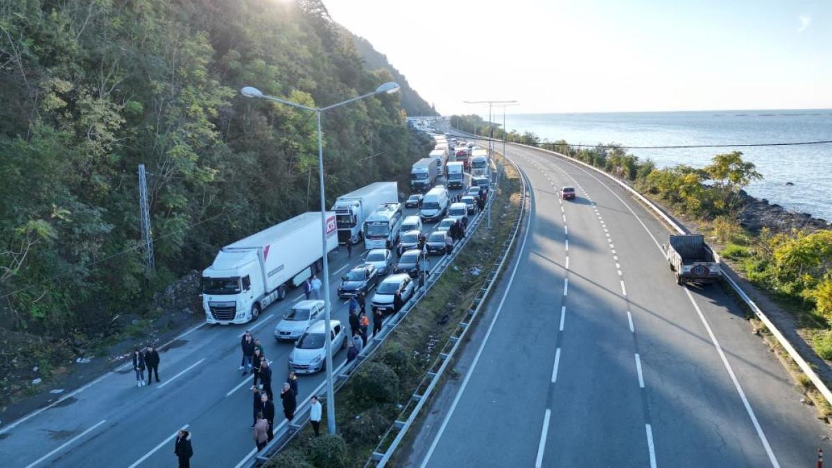 Yolun heyelan nedeniyle kapanmasının ardından bölgedeki araç trafiği de kilitlendi.
