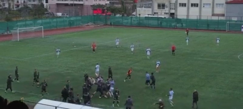 Amatör lig maçında iki takımın futbolcuları arasında çıkan kavga kameraya saniye saniye yansıdı. Sahaya giren polis ekipleri müdahale ederek kavgayı ayırdı.