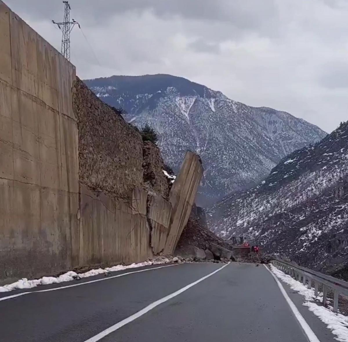 Görüntülerde; duvarın çökmesiyle çevreyi toz bulutunun kapladığı, yamaçtan kayan irili ufaklı kaya parçalarının da yola aktığı görüldü.