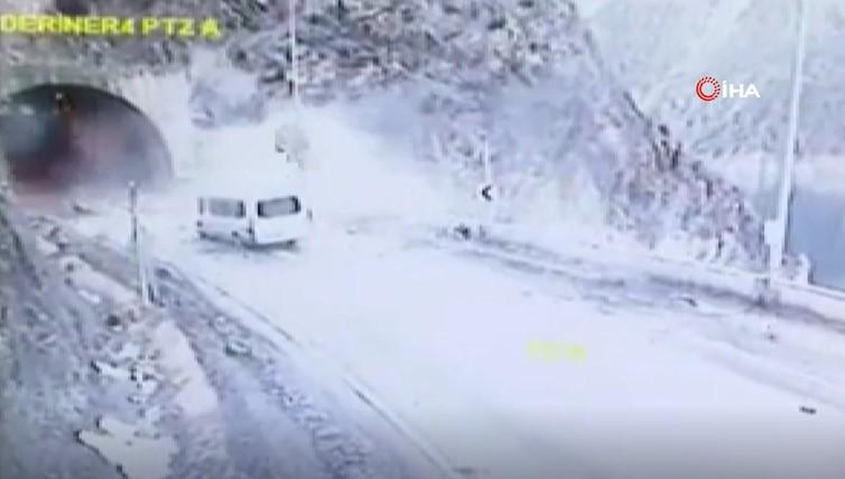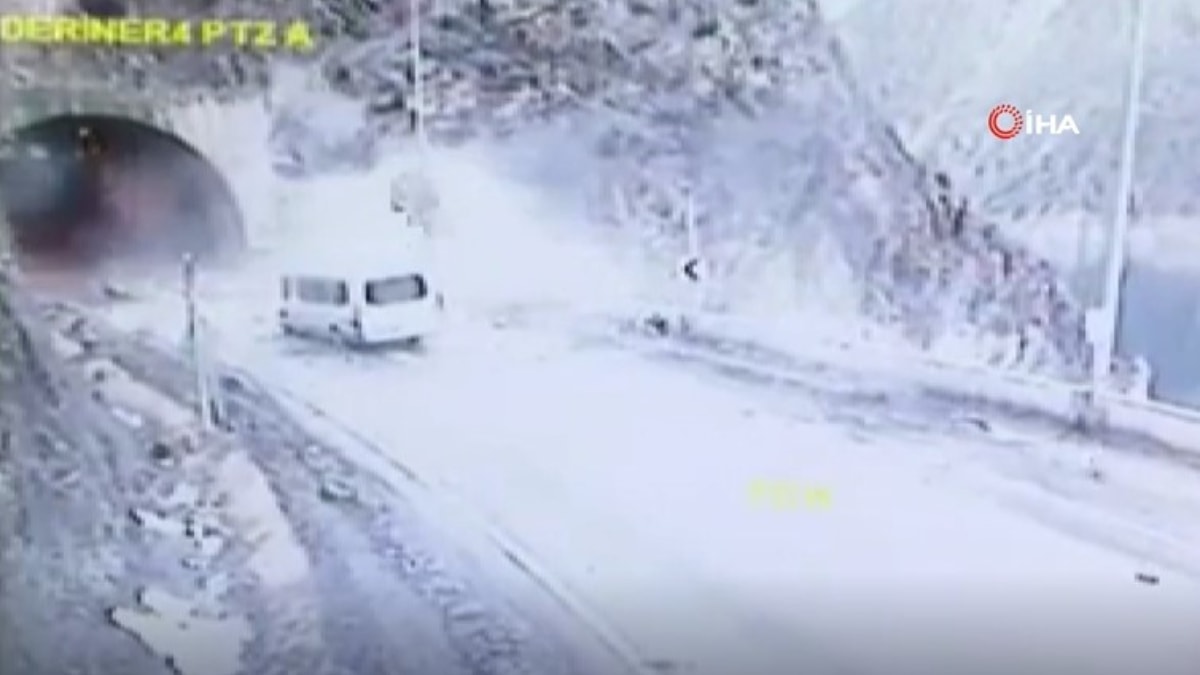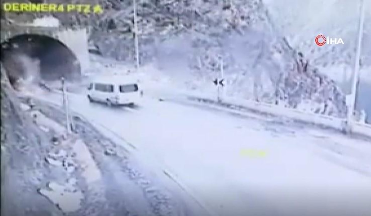 Güvenlik kamerasına yansıyan görüntülerde, seyir halinde olan minibüs, tam tünele gireceği esnada üzerine yamaçtan kaya parçaları düştü.