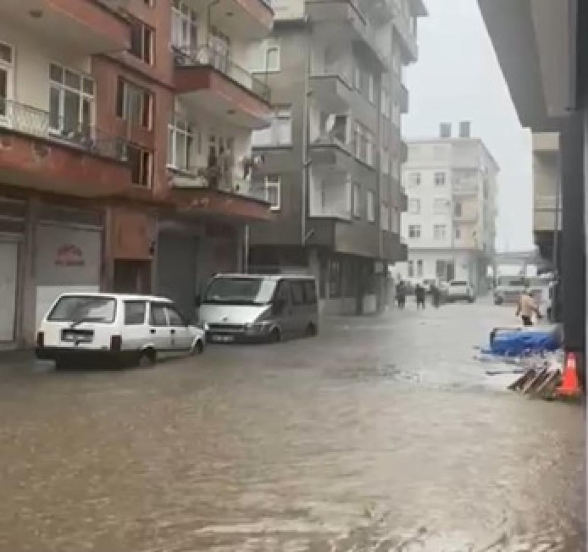 Yağışın etkisiyle ilçe merkezindeki su kanalları ve rögarların tıkanması üzerine cadde ve sokaklar suyla kaplandı.