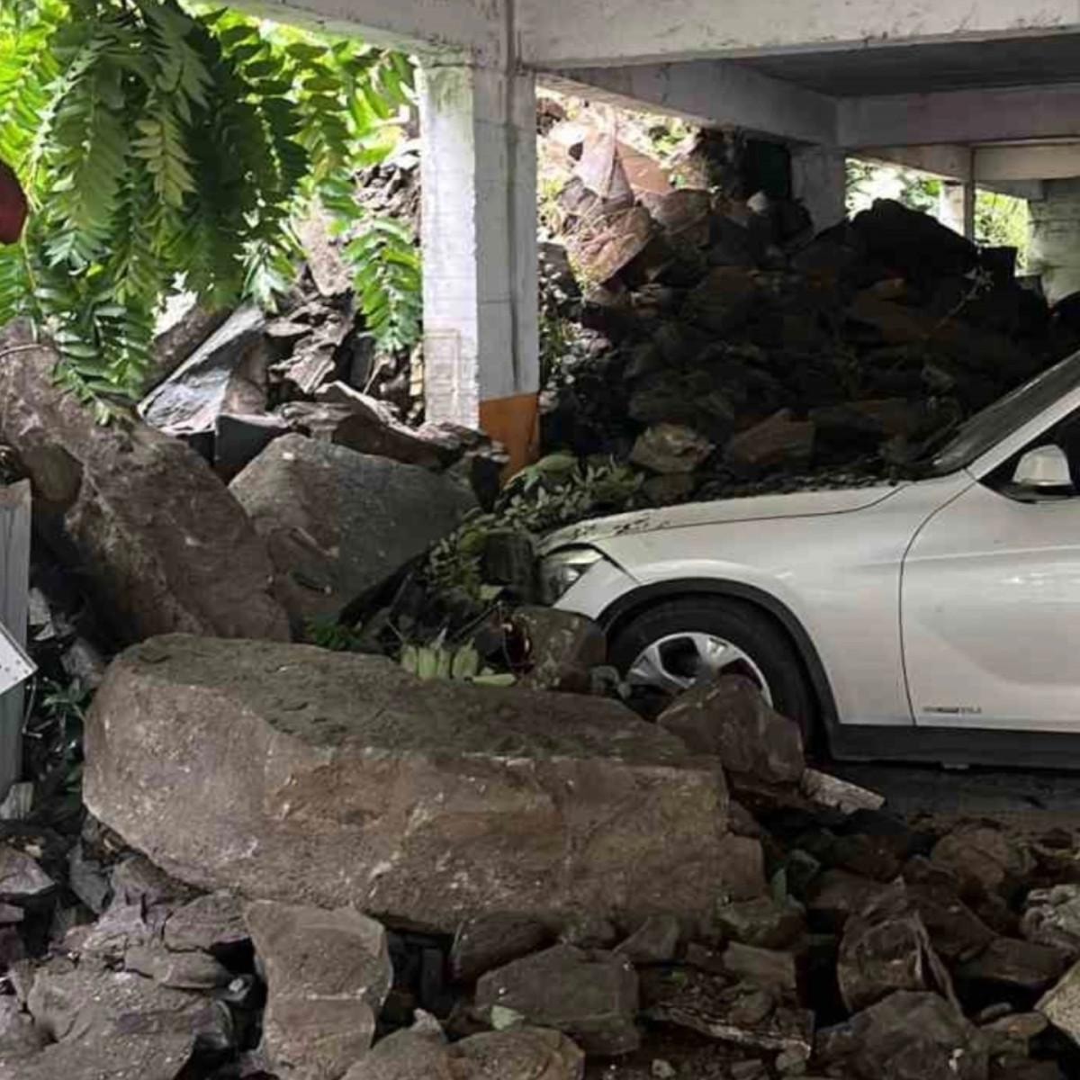 Orta Hopa Mahallesi'nde yamaçtan kopan kaya ve toprak kütlesi, bir apartmanın otoparkındaki 6 otomobil ve 1 motosiklete zarar verdi.
