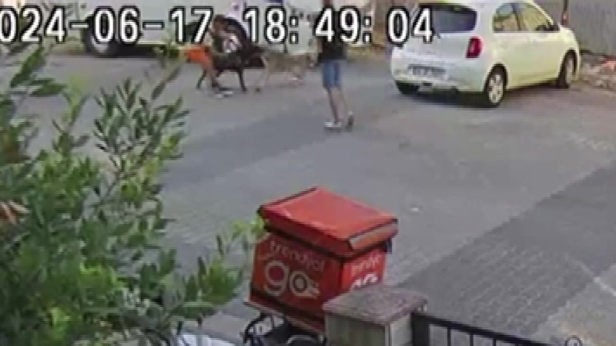 Köpeklerin kavga ettiği anlar ve ardından yaşananlar güvenlik kamerasına yansıdı.