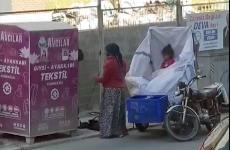 Benzer görüntüler, Mustafa Kemal Paşa Mahallesi Beyoğlu Caddesi'nde de görüldü. Tehlikeli olmasına rağmen giysi kumbarasının içerisine giren çocuk tarafından çıkarılan ikinci el giysiler yine çekçek araçlarına dolduruldu. O anları çevredekiler, cep telefonu kamarasıyla görüntüledi.