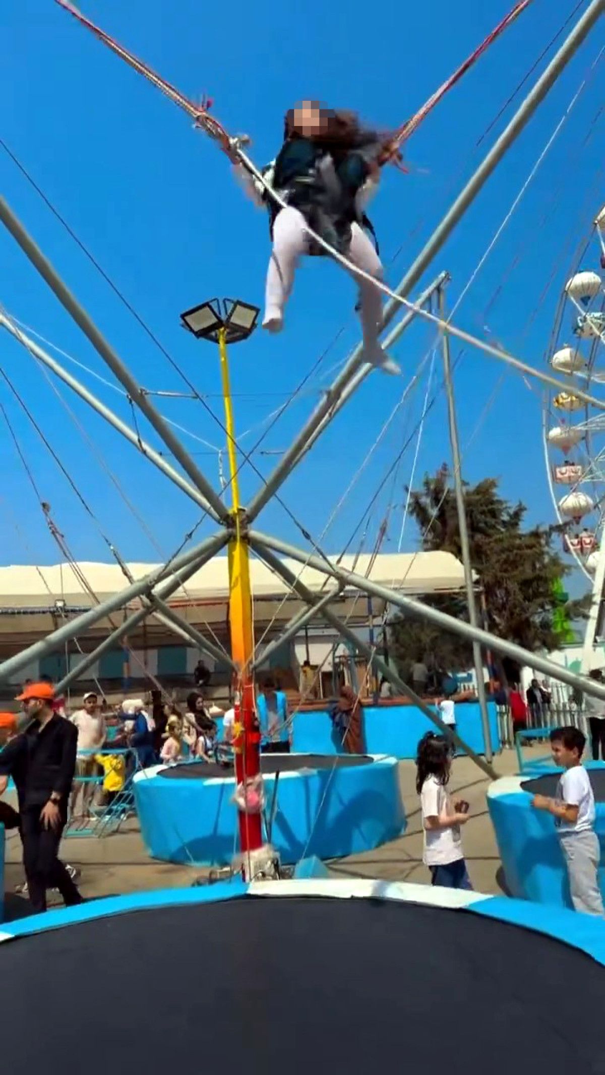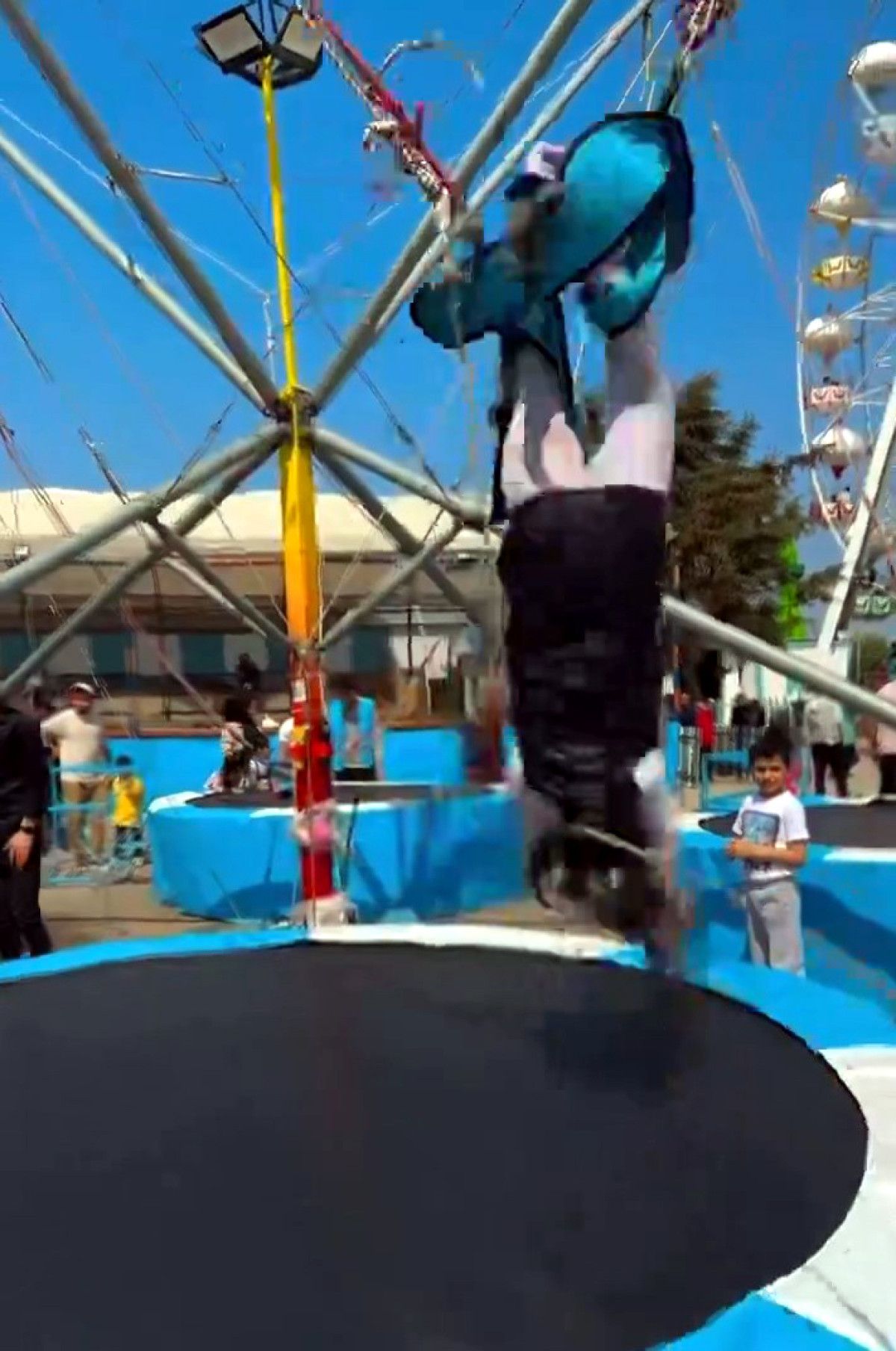 Dengesini kaybeden çocuk dakikalarca salıncakta savrulduktan sonra trambolinin üzerine düştü. Yara almadan kurtulan çocuğu gören ailesi panikle sarılarak düştüğü yerden aldı.