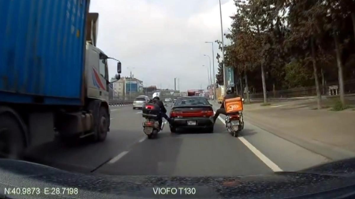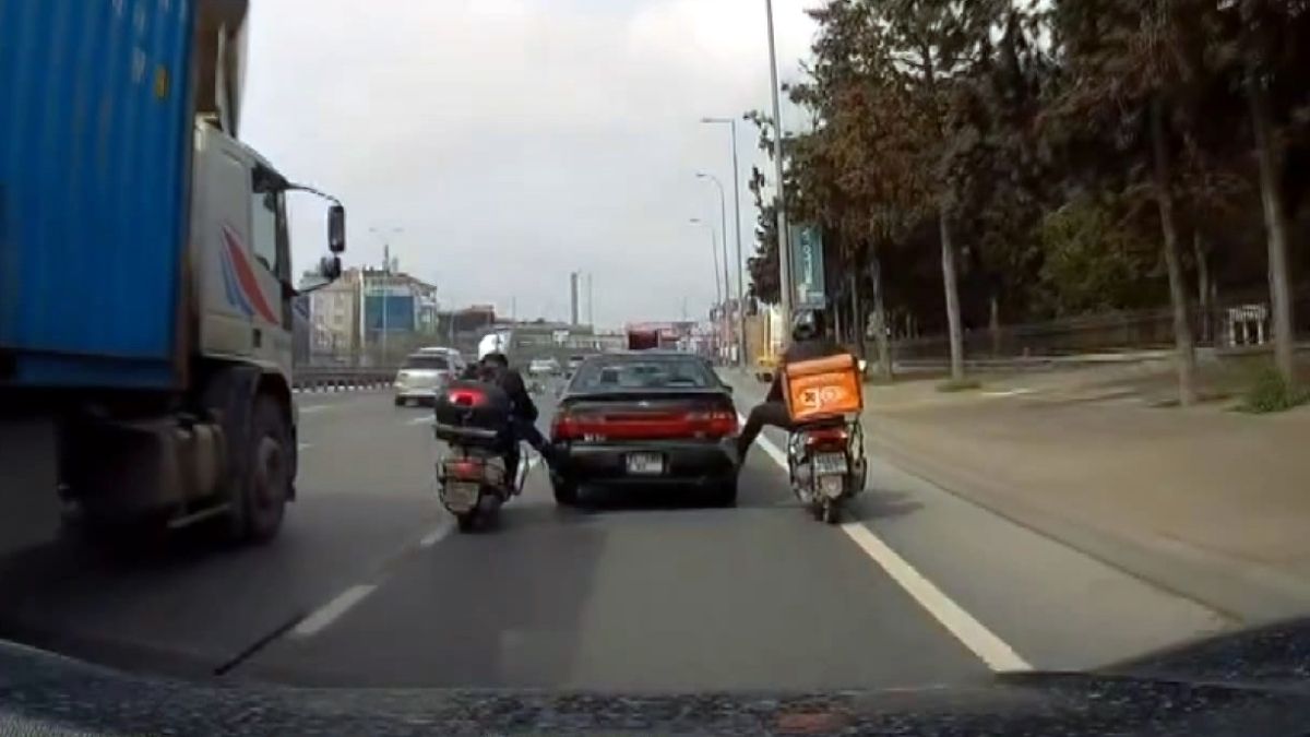 İstasyon girişinde ise motosiklet sürücüleri motordan inerek otomobili itmeye başladı. O anlar bir otomobilin araç içi kamerasına yansıdı.