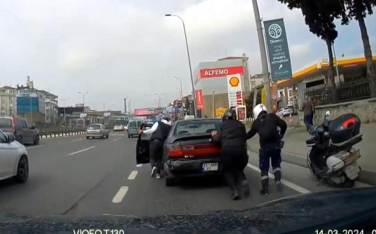 İstanbul'un Avcılar ilçesinde yakıtı biten otomobilin sürücüsü yolda kaldı. Sürücünün imdadına iki motosiklet sürücüsü yetişti.