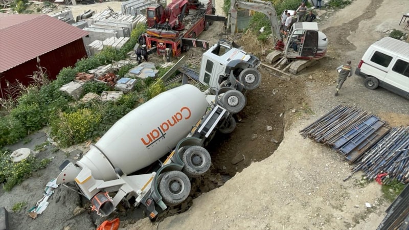 Kadınlar Denizi Mahallesi'ndeki bir inşaat alanına beton taşıyan ve sürücüsü öğrenilemeyen mikser, stabilize yolun çökmesi sonucu oluşan çukura düşerek yan yattı.