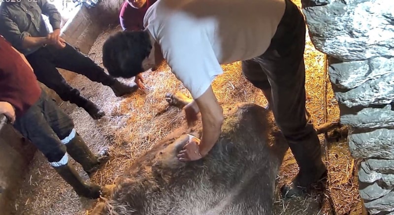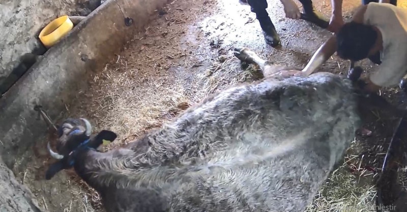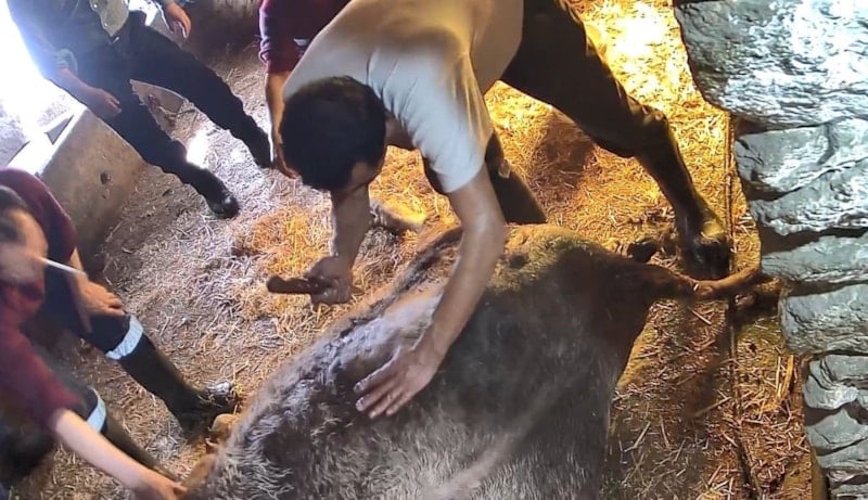 Ahıra gelen S.T., doğmakta olan buzağının ayaklarına ip bağlayarak çekme yöntemiyle doğuma yardımcı olmaya çalıştı. Ahırda bulunan yaklaşık 5 kişinin desteğine rağmen doğum gerçekleşmeyince bu kez cerrahi müdahale kararı alındı.