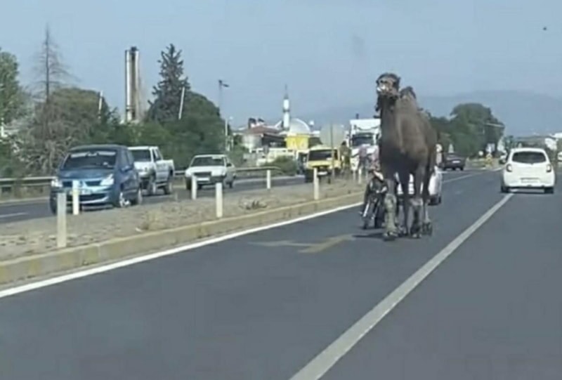 Ters yönde ilerleyen deve, sürücüler için tehlike oluşturdu.