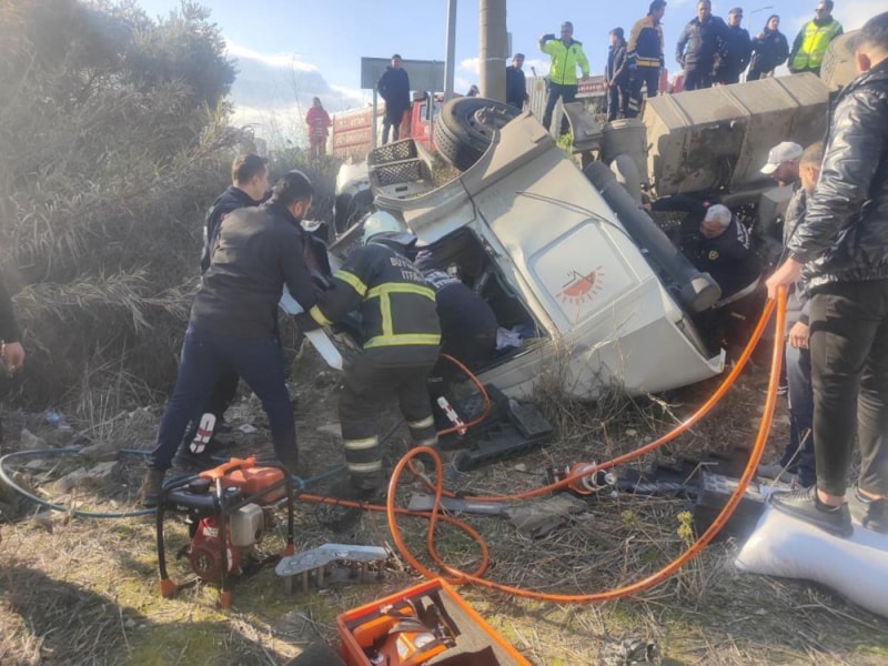 Aydın'ın Kuşadası ilçesi Yeniköy yolu üzerinde virajı alamayarak yol kenarındaki tarlaya uçan yem yüklü tırda bulunan sürücüyle birlikte 4 kişi araçta sıkıştı.