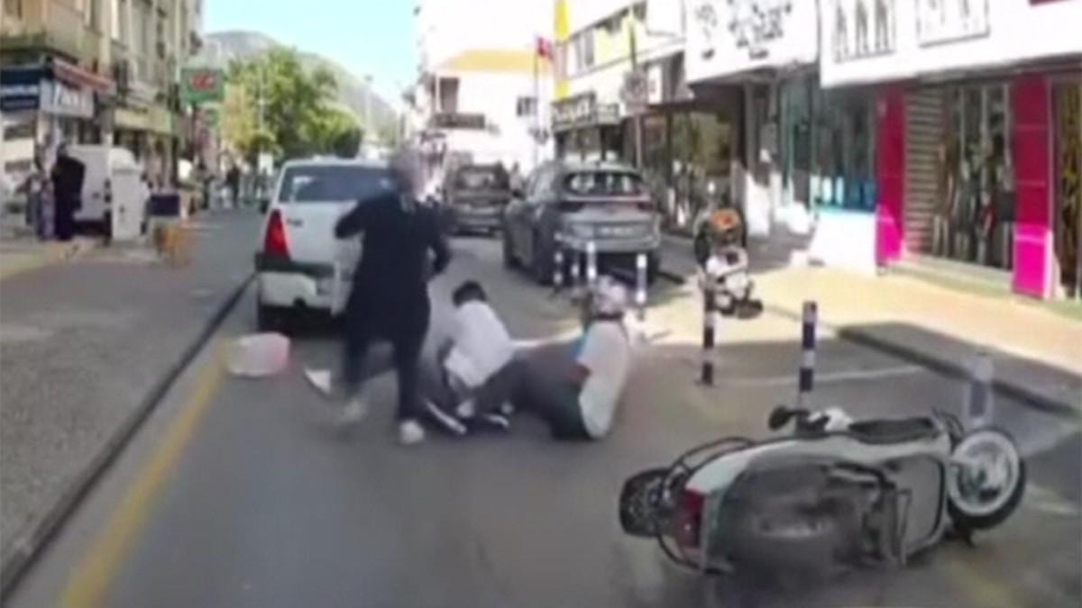 Görüntülerde yolun karşısına geçmek isteyen kadını fark eden otomobilin yavaşladığı ve otomobilin sağından gelen motosikletin kadına çarptığı anlar yer aldı.